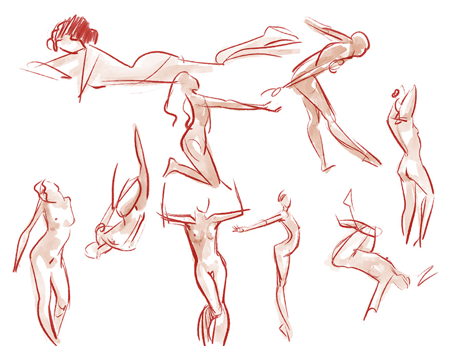 Die Schwierigkeit bei Schnellskizzen liegt im Festhalten der Bewegung mit möglichst wenigen Strichen. Es bedarf einiger Übung sich auf das Wesentliche zu konzentrieren und Unnötiges wegzulassen. Ich selbst versuche den Bewegungsfluss ohne viel stricheln zu skizzieren. Dazu nutze ich Aktionslinien, die den Bewegungsfluss charakterisieren. Je mehr Zeit ich habe, desto mehr Details füge ich nachträglich hinzu. Es geht nicht darum, den perfekten Strich zu erzielen. Gerade diese ungenauen, unperfekten Linien geben der Zeichnung die nötige Dynamik und Frische.