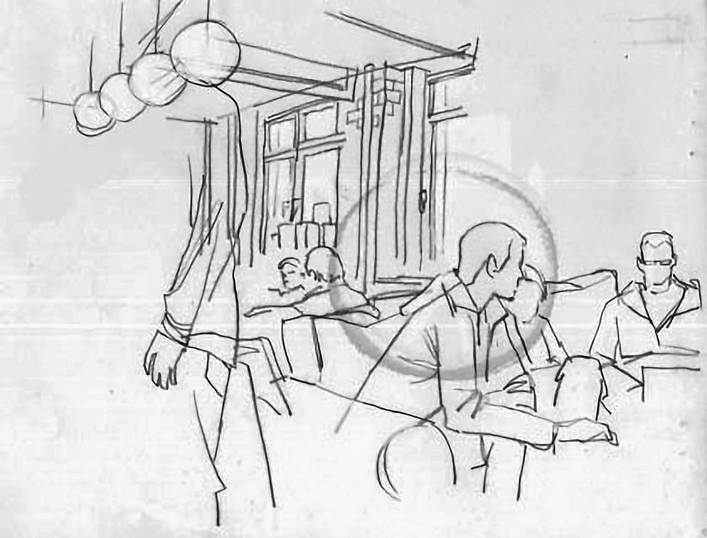 Nach meiner Rückkehr habe ich die Bleistiftskizzen eingescannt. Die weissen Flächen und die Kaffeetassen-Ränder habe ich nachträglich digital eingearbeitet. Die Möglichkeit analoge und digitale Bildelemente zu mixen ergebenden schier unerschöpfliche Kreativlösungen.