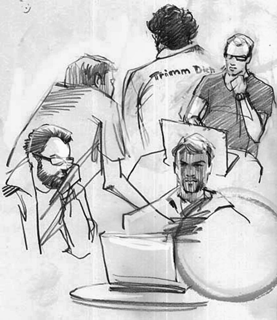 Ich nutze die Zeit zwischen den einzelnen Vorträgen, um die Atmosphäre vor Ort auf einem Skizzenblock festzuhalten. Ich benötigte pro Schnellskizze circa 5 ‑10 Minuten.